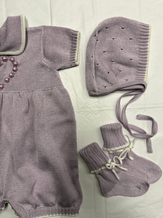 Mavi Set Neonato in Maglia di Cotone - Tutina, Cuffietta e Calzini - Lilla Vintage con Dettaglio Cuore